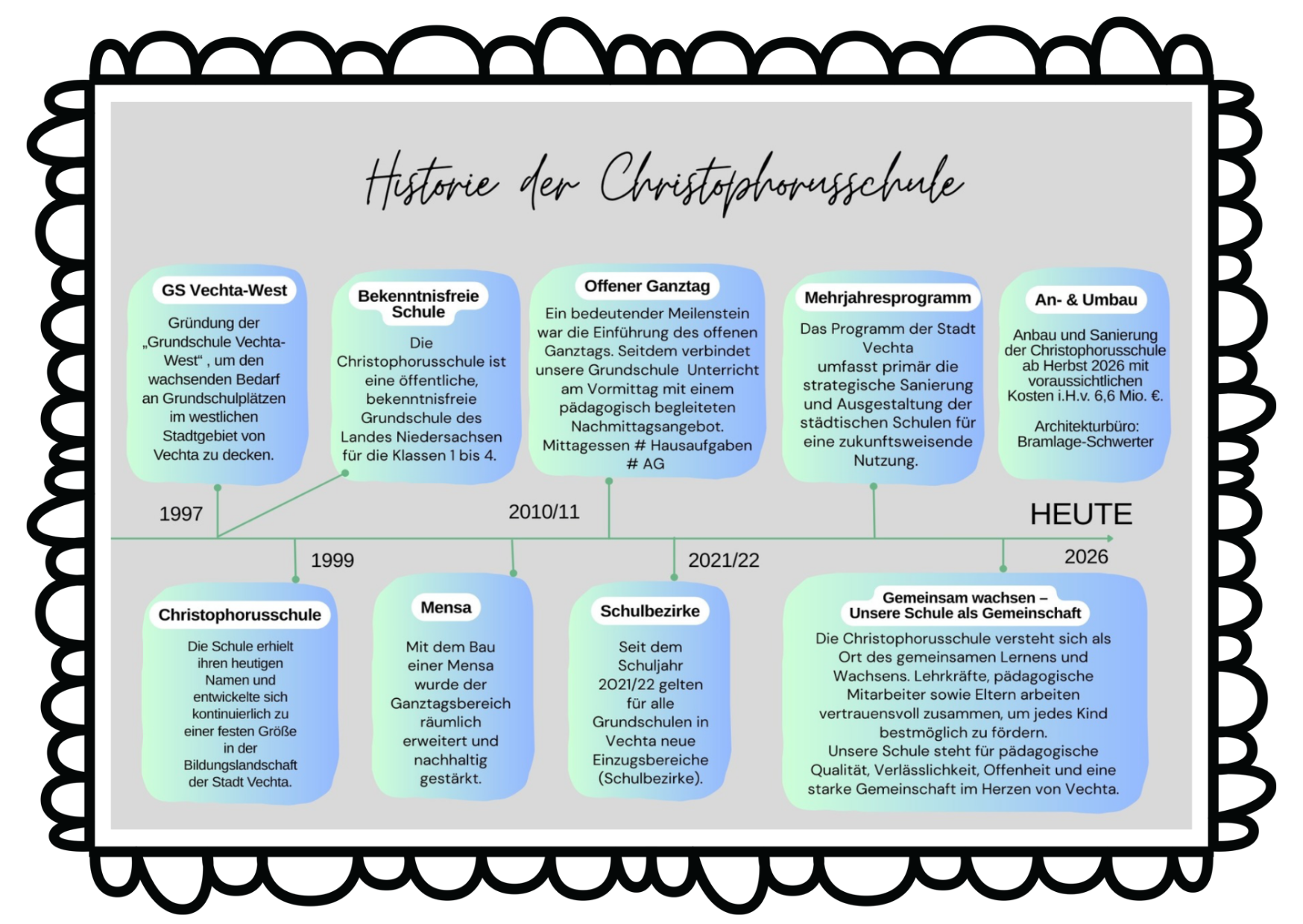 Ein Blick auf die Entwicklung unserer Schule seit ihrer Gründung im Jahr 1997. Unsere Wurzeln bilden dabei das Fundament für das, was wir heute sind. Aus einer jungen Grundschule ist ein lebendiger Lernort gewachsen. Was 1997 begann, ist heute eine starke Schulgemeinschaft. 2027 werden wir das 30jährige Bestehen der Christophorusschule feiern.