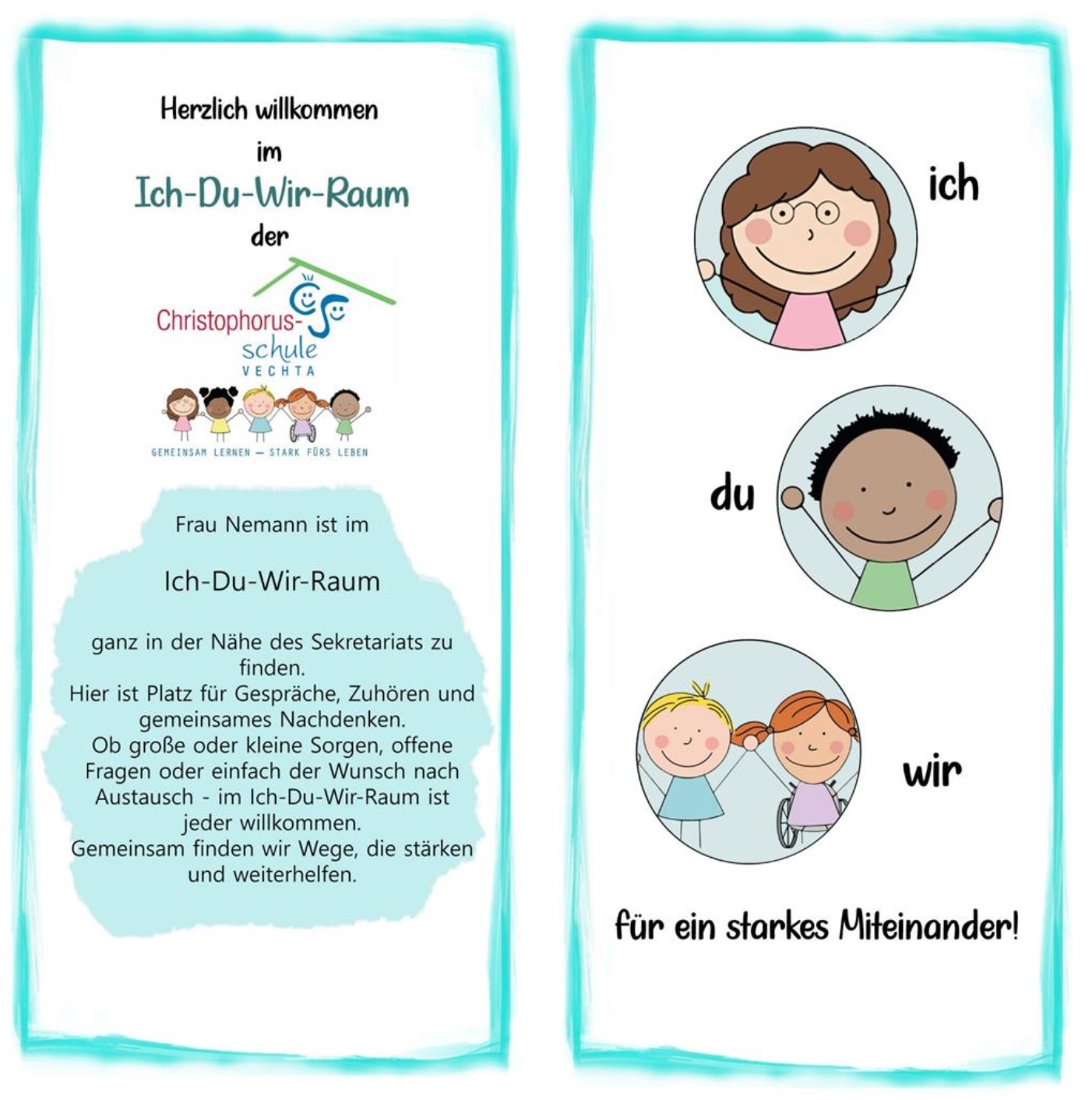 Der „Ich-Du-Wir-Raum“ ist der geschützte Ort der Schulsozialarbeit an der Christophorusschule. Hier ist unsere Schulsozialarbeiterin Frau Nemann für alle Kinder eine verlässliche Ansprechpartnerin.